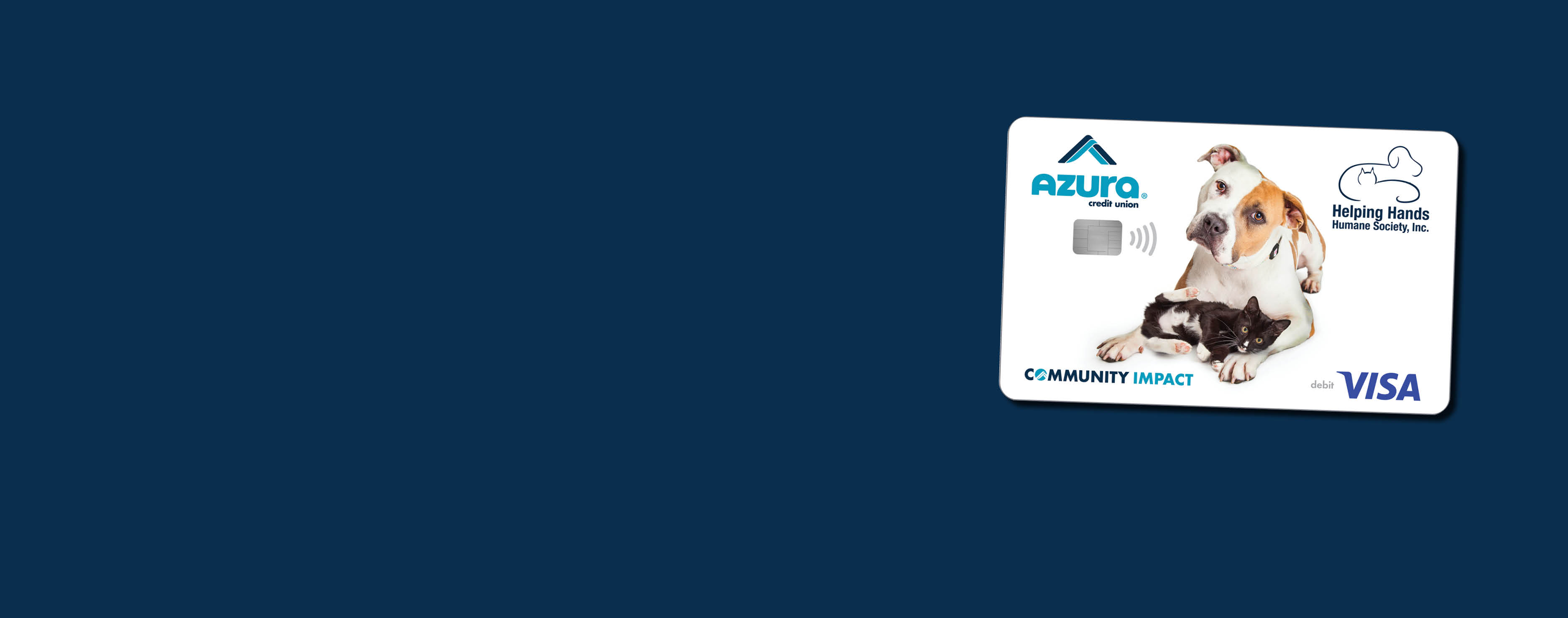 Every purchase you make with a Helping Hands Humane Society Community Impact Visa® Debit Card helps support local lost and homeless pets — at no cost to you. Azura donates five cents per transaction, turning everyday spending into meaningful support for local programs and schools that strengthen our community.